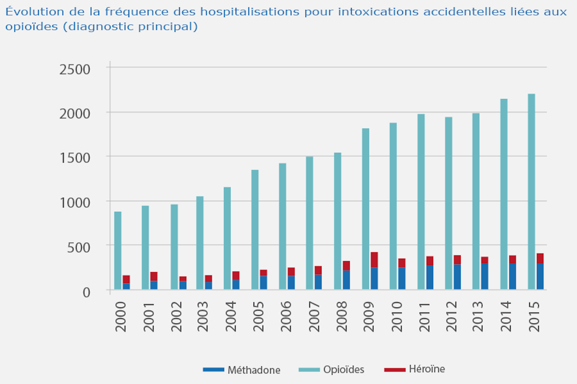 Reprenant les travaux de l’Observatoire français des médicaments antalgiques (OFMA), l’ANSM rapporte que le nombre d’hospitalisations consécutives à des overdoses d’antalgiques opioïdes obtenus sur prescription médicale a augmenté de 167 % entre 2000 et 2017. Entre 2000 et 2015, le nombre de décès liés à la consommation d’opioïdes a augmenté de 146 %, soit au moins au moins 4 décès par semaine.